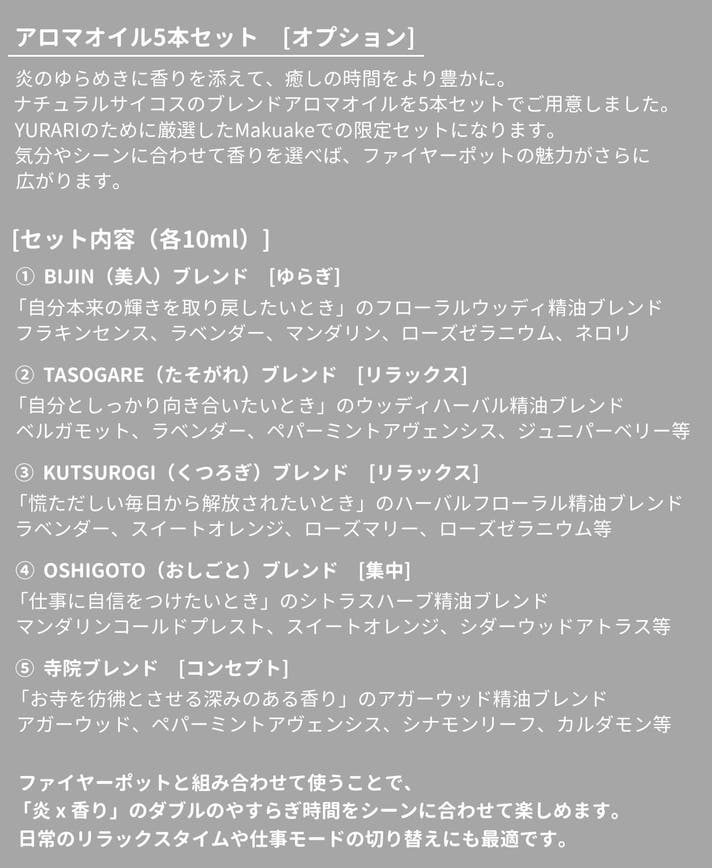 『 YURARI 』は、ゆれる炎とアロマの香りで、あなたの五感を包み込みます。