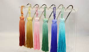 組み紐は房の色に合わせて職人が選んだ絹糸で組み上げます。