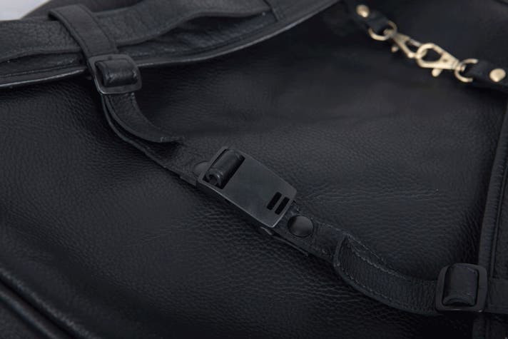 ワンタッチで装着・調整可能なチェストベルト採用。オールレザー仕様で、体型や服装に応じて柔軟にフィットし、従来のバックル式に比べて装着が格段にスムーズです。