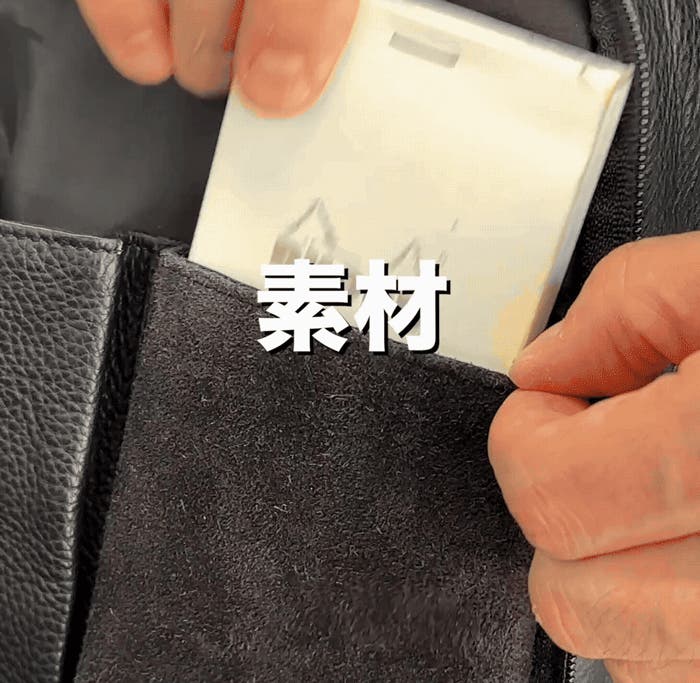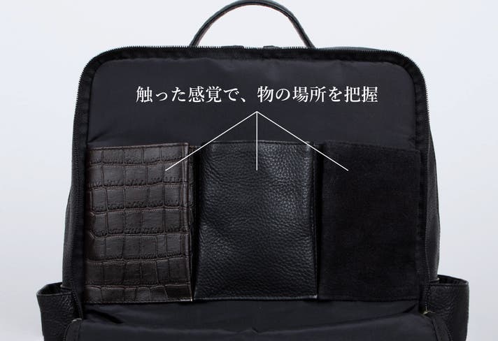 たとえば、硬くゴツゴツした素材のポケットにはデリケートな電子機器を、ザラザラとした素材のポケットにはメモ帳を収納するなど、感覚的に物の場所を把握できます。