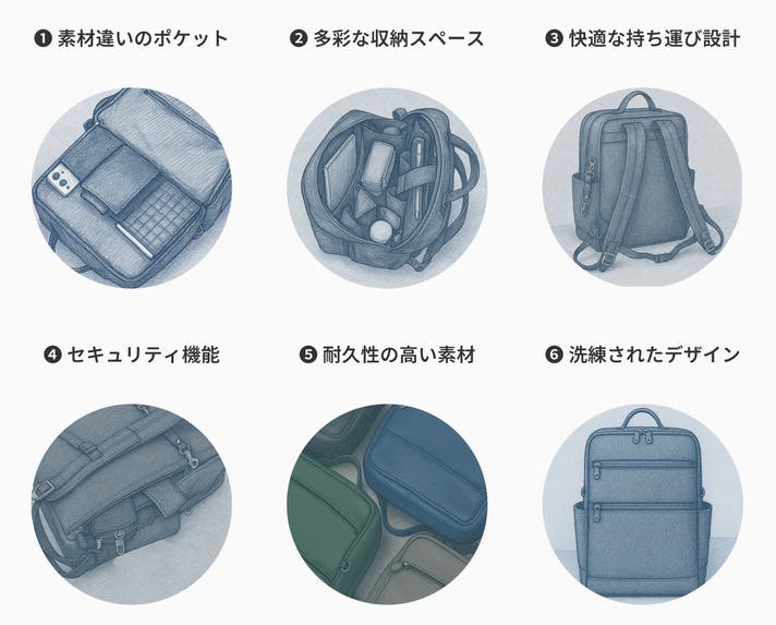 このバックパックには、日々の暮らしをより便利で快適にするための6つの工夫が詰まっています。たくさんの声をもとに、使いやすさと機能性を追求しました。