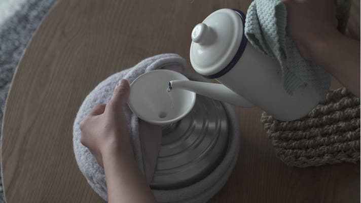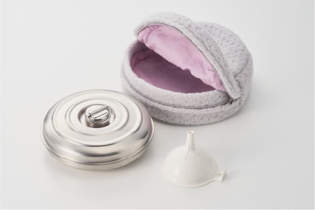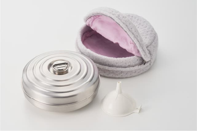 使う時は、本体をカバーに入れたまま付属のろう斗を使ってお湯を注ぎ、蓋を閉めたらチャックを閉じるだけ。直接熱くなった本体に触らず湯たんぽが作れるので、やけどの心配も面倒な準備も必要ありません。