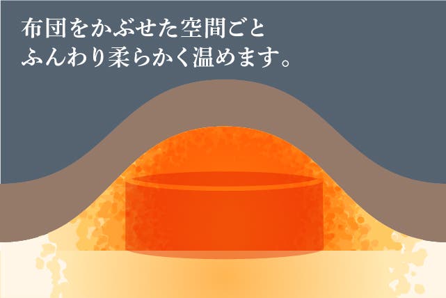 ウールカバーに包まれた状態なら生地の厚みのおかげで熱くなりすぎず快適な温度で布団を温めます。コタツのように包まれた空間ごと温めるというのがポイント。