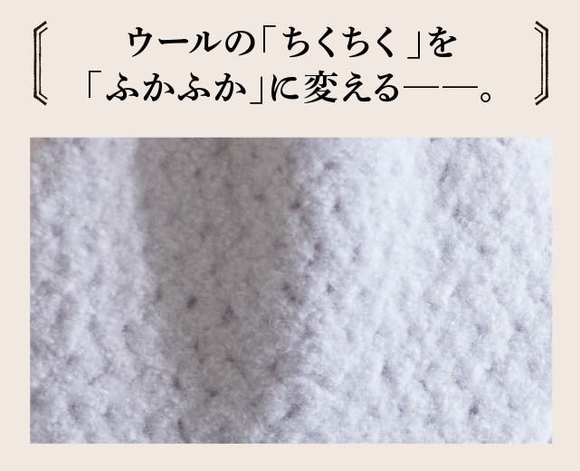この工程で、ウール表面のウロコ状の「スケール」が絡み合い、生地の目がしっかりと詰まることで、保温性がさらに高まり、肌への刺激が驚くほど軽減されます。