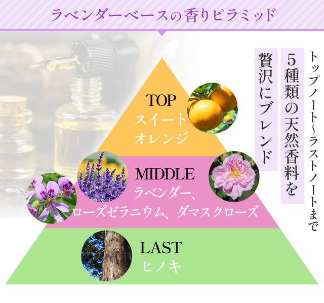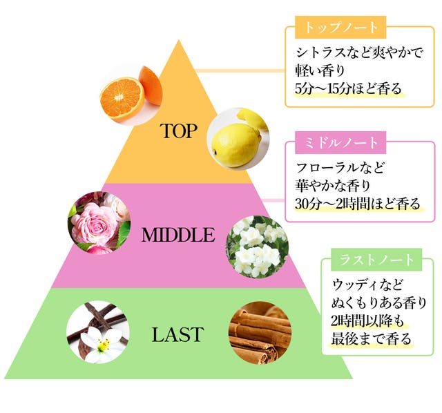 香りには、「トップノート」「ミドルノート」「ラストノート」と呼ばれる3つに分かれた香りのピラミッドがあります。