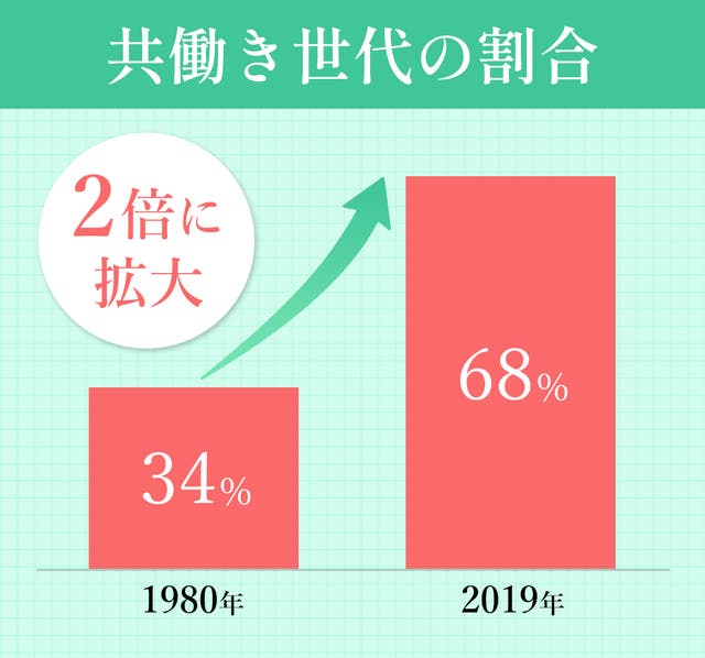 女性の社会進出や収入面 / 将来への不安から、1980年には36%だった共働き世帯が、2019年には68%※2と年々増え続けています。
