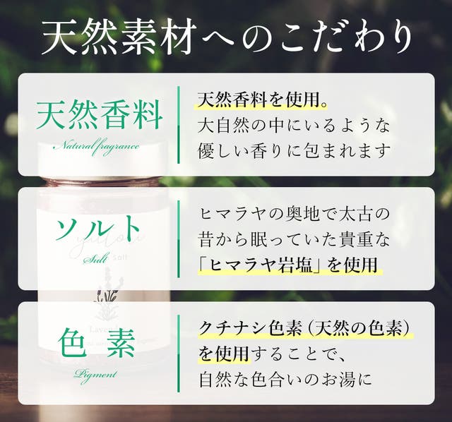 yutoriのバスソルトは「香り」はもちろんのこと、含まれる成分を「天然素材」で仕上げています。