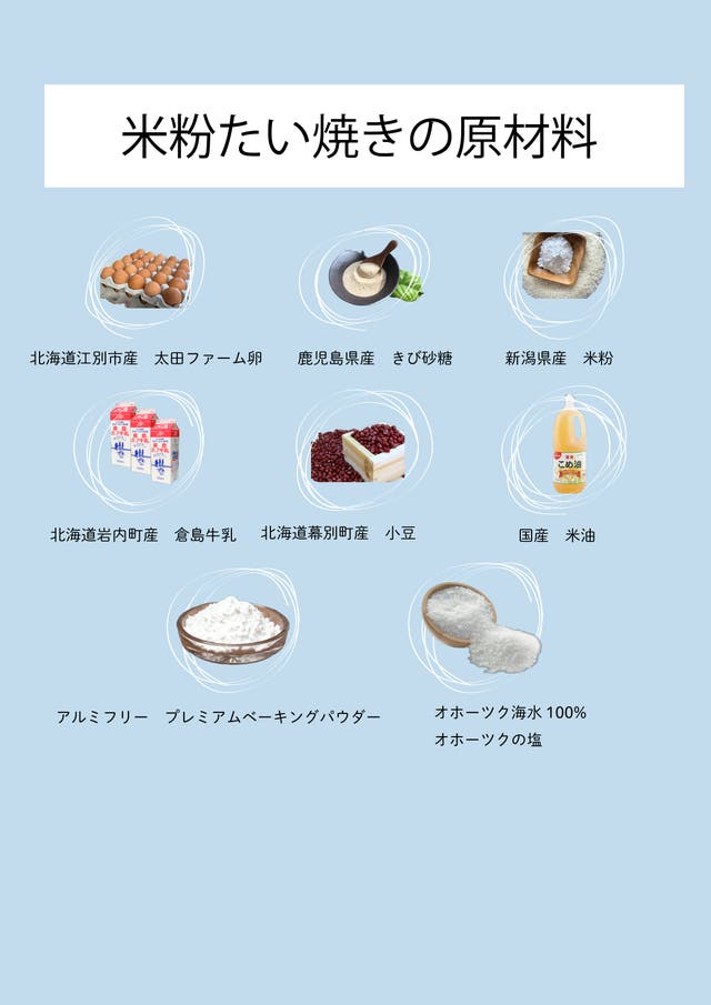 原材料▶︎たい焼き:米粉(新潟産製造)、倉島牛乳(生乳(北海道産))、卵白(卵を含む、北海道産)、ナチュラルチーズ(生乳、食塩)、きび砂糖、米油、塩/膨張剤、セルロース、カルテノイド色素
