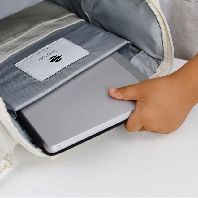 ランドセルと同じ背負い型のかばんでも、型崩れしない「箱」の通念から解放されることで、素材にナイロンやポリエステルのような繊維を用いることが可能となり、これによりバックルやギボシ、カンや鋲などの硬い金属パーツも必要としません。子供の手や身体にとってより優しい素材や部品を使えるため、ZACARIの通学はいのうはかばん全体の佇まいや触り心地も優しく柔らかなのが特徴です。