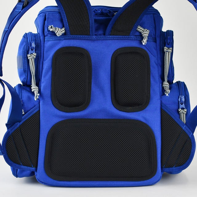 背面が背中に密着しないよう通気性を考慮した衝撃吸収設計の背面メッシュパッド