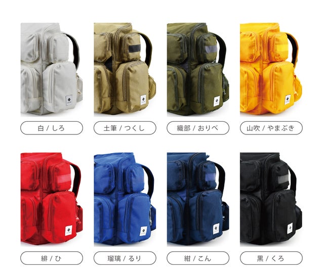 濃色で落ち着いた雰囲気の黒、紺、織部(おりべ)。淡色系で爽やかなイメージの白、土筆(つくし)。原色系で明るく元気な印象の緋(ひ)、瑠璃(るり)、山吹(やまぶき)。この楽しい8色の展開色は、男の子にとっても女の子にとっても、すべての色が自分の好みや個性を映し出す選択肢です。
