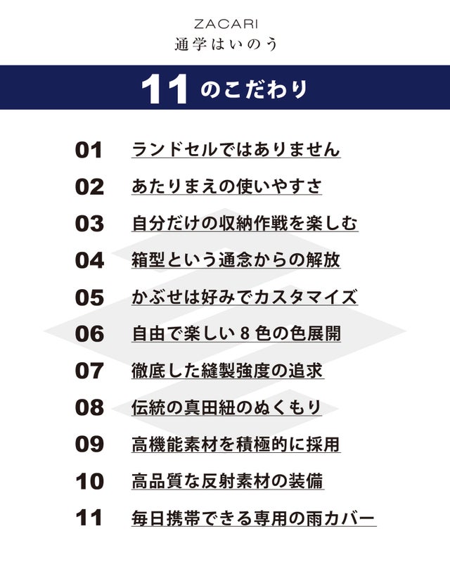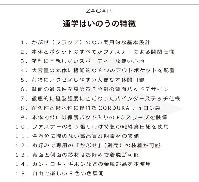 そんな流れの中で、わが国の小学生が使う通学かばんだけはいわゆる「ランドセル」という選択肢があればそれでいいという発想はもはや開明的でも進歩的でもなく、残念ながら現状維持主義で付和雷同的だとさえ言えます。このマインドセットから一人でも多くの日本の小学生が解放されてほしいという一念からZACARIの「通学はいのう」は誕生しました。