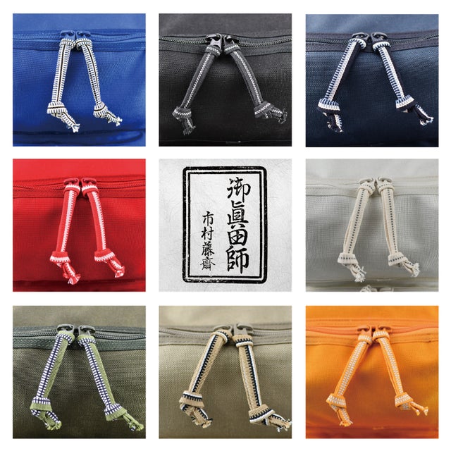 毎日何度も開けたり閉めたりするファスナーの引っ張りには丈夫でありながら手触りの心地良い素材にしたい。そのこだわりから、すべてのファスナーの引き手には関東唯一の真田紐師、市村藤斎製の真田紐を引っ張りとして装備しています。すべての柄や配色がZACARIのために特別に織られた別注紐です。