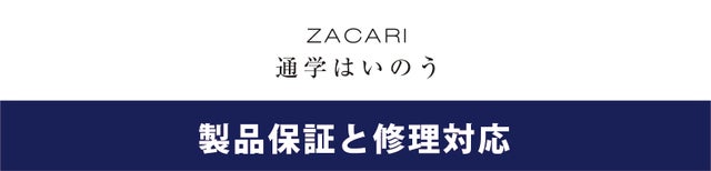 ZACARIは通学、通勤そして日常生活の全般において、できるだけ長くお客様にご愛用頂けるかばんの製造を心掛け、不良や故障の際にはお客様に可能な限りご満足いただける保証および修理対応をお約束いたします。
