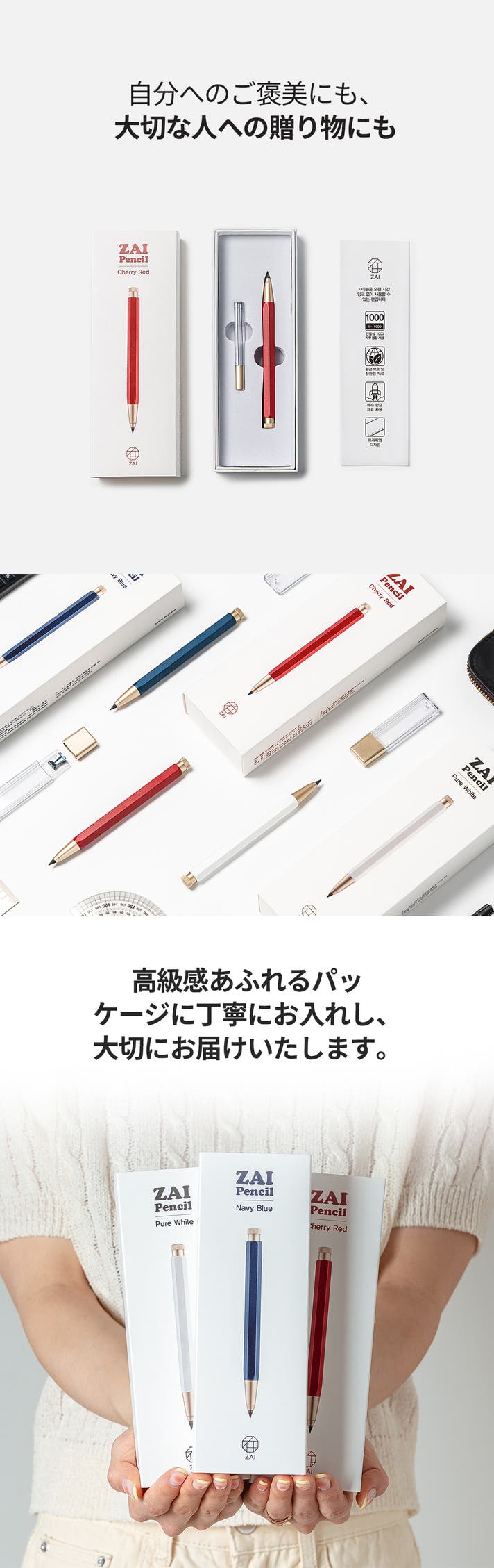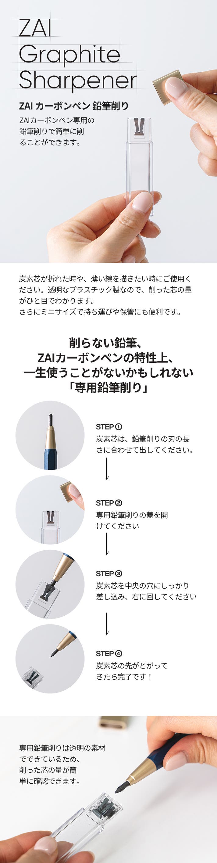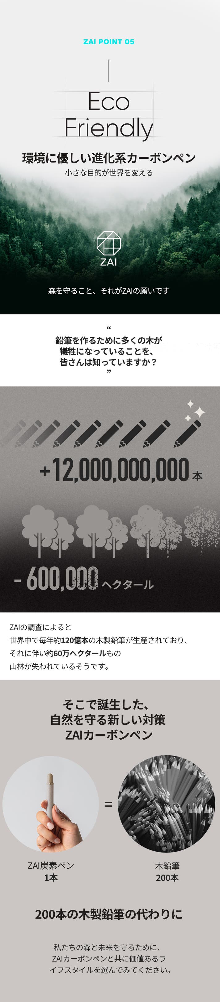 ZAI炭素ペンは鉛筆芯の圧縮加工技術を利用して削らずに使える鉛筆を製造している企業です。ZAIブランドは鉛筆に使う木を保護するために企画されたプロジェクトです。この企業は木材の保護と環境に配慮したブランドであり、高級文房具の新たなパラダイムを創り出しています。