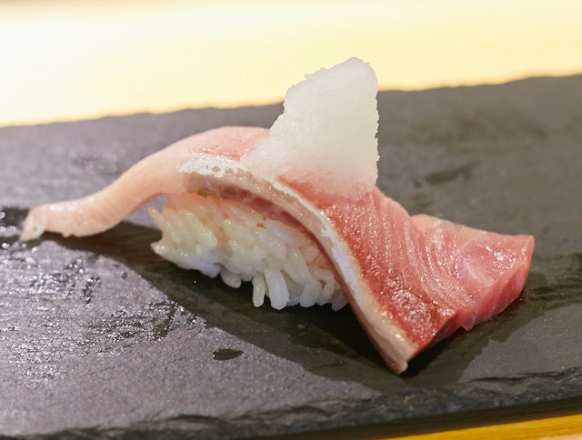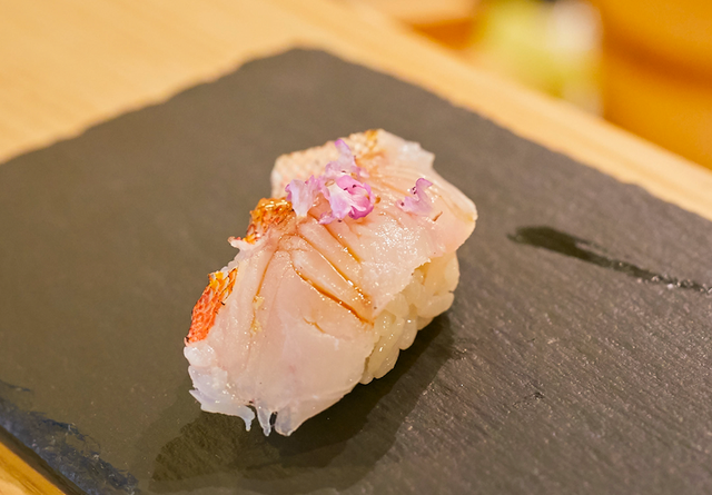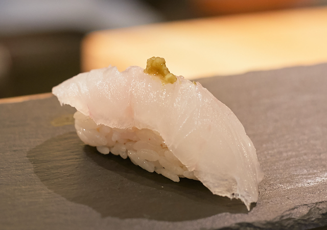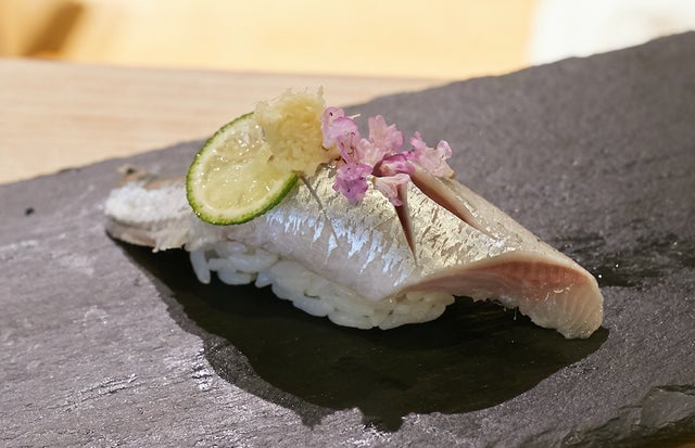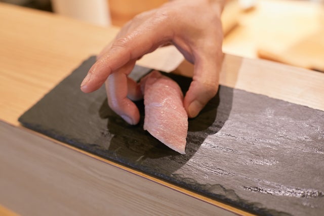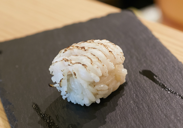 水揚げされたイワシ中でも鮮度のいいものだけを仕入れ、握っております。イワシの芳醇な甘みが口いっぱいに広がる一品です。また、シャリは様々な米を経て出会った岐阜県の古米「ハツシモ」を使用。『然』が求めるベストの歯応えが感じられるものを仕入れております。