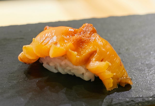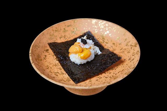 北海道を中心に全国から最高級のウニを仕入れ、海苔を敷き、一口サイズのシャリの上にたっぷりのせました。ウニは一般的に「北海道産のエゾバフンウニ」が最高級と言われていますが、季節やタイミングによって品質が異なります。『然』では、ご来店時に最高の状態のものをご用意いたします。