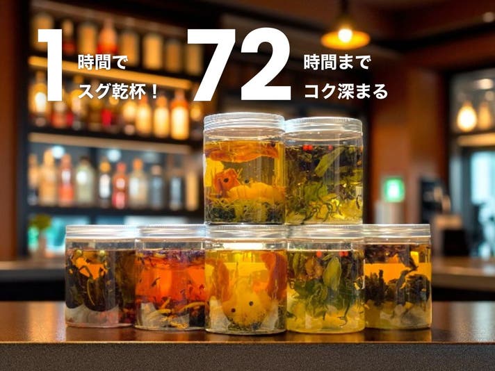 お茶をお酒で抽出することで、茶葉に含まれるカテキンなどの成分はもちろん、個性豊かなお茶の苦み、酸味、旨味、薫香、渋みなどが溶け出していきます。さらにドライフルーツやスパイスから香り成分もお酒に移り、まさにカクテルという芳醇でまろやかな味わいの「ティーカクテル」が生まれます。