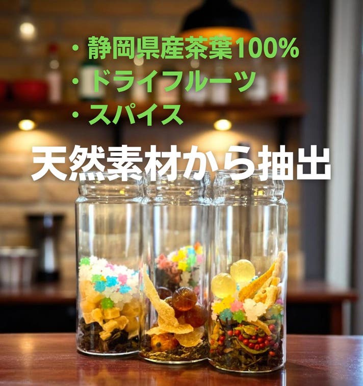 茶(静岡県産)、ドライフルーツ、スパイス(山椒・生姜等)、砂糖(こんぺいとう等) ほか
