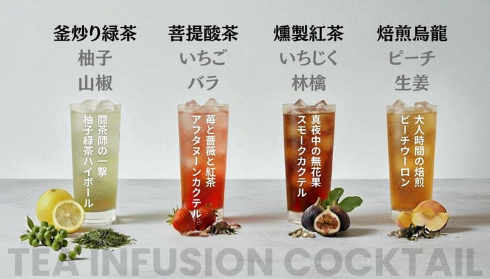 お茶だけでなく、ドライフルーツやスパイスなどから香りや風味、甘みが抽出される事でお茶割り以上の「お茶カクテル」の風味が実現されます。