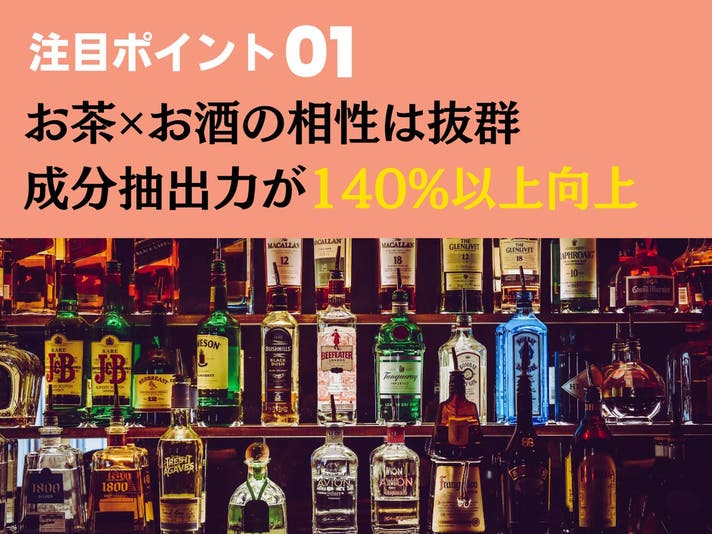 お茶とお酒の相性は抜群で、お水やお湯に比べカテキンの抽出効率が140%以上向上することが実証されています。
