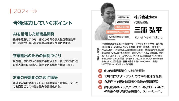2023年に帰国後、「日本のグローバルにおけるプレゼンスを高めたい」という想いから株式会社dozoを創業し、自らも静岡市葵区で茶農家として就農しました。現場で働く中で目の当たりにしたのは、高齢化により圃場管理を諦める茶農家が増え続けている現実です。2024年度だけでも、私の周辺で4件の農家さんが収穫を断念されました。