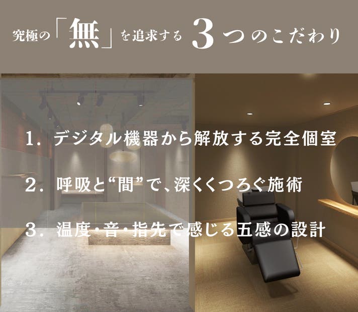 私たちは、都会にいながらも「短時間で深くくつろげる」環境を提供したいと考えました。温度・音・指先の触れ方を設計し、60分で極上の「無」に没入できる環境を用意します。