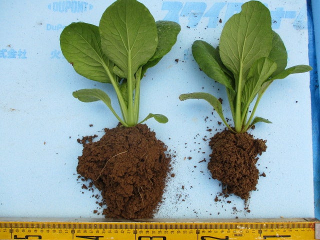 収穫サイズ(葉の高さは25㎝)を根の張り具合を検証した写真で土の付き具合に大きな違いが出ています。
