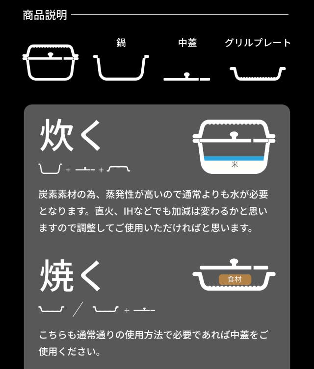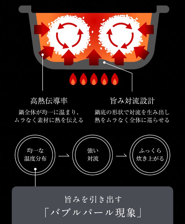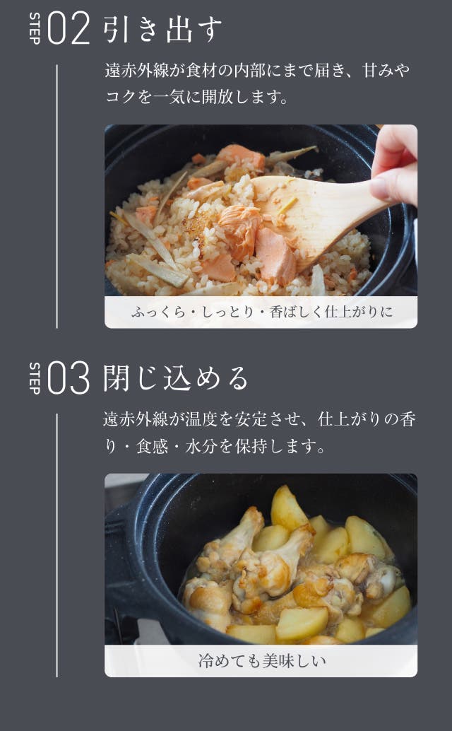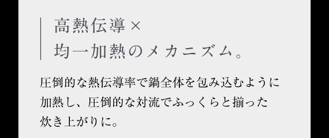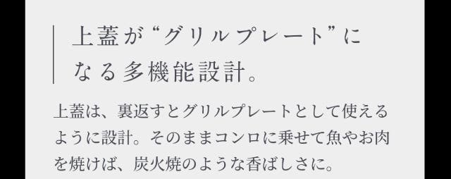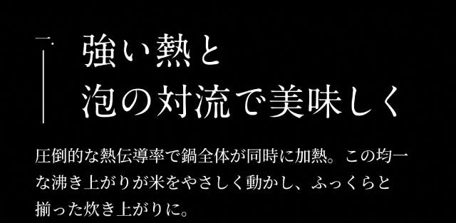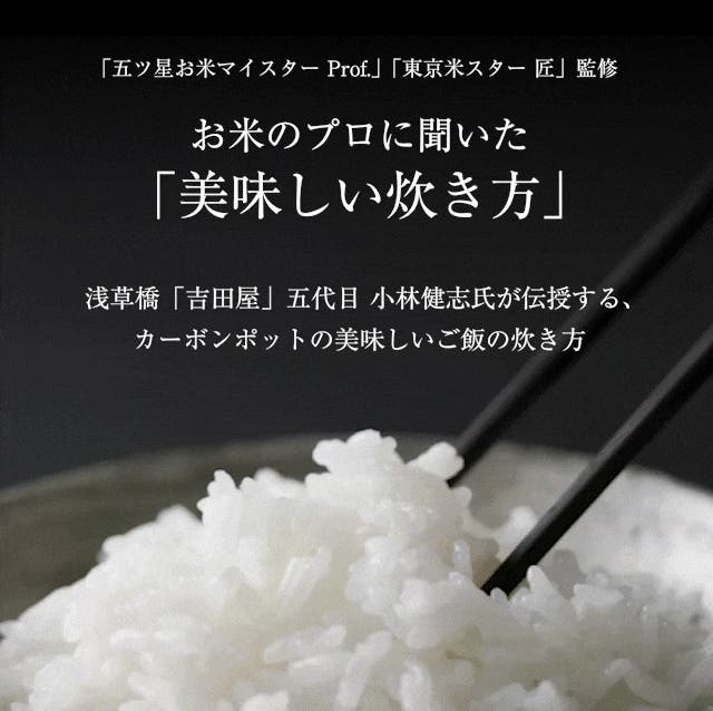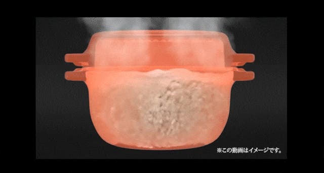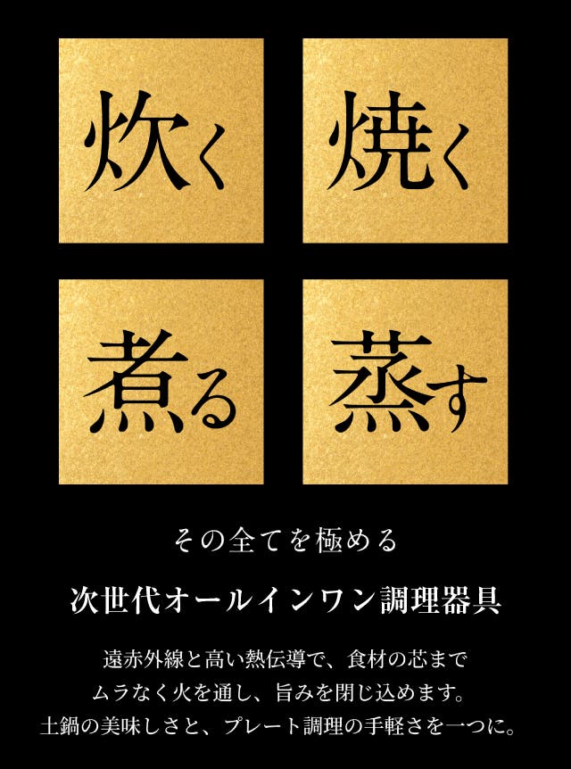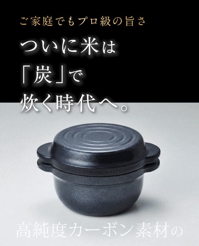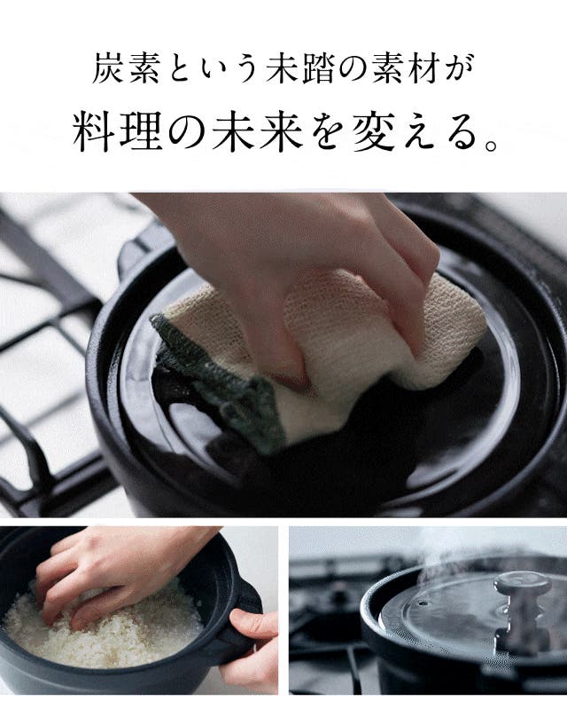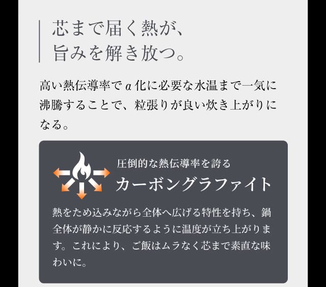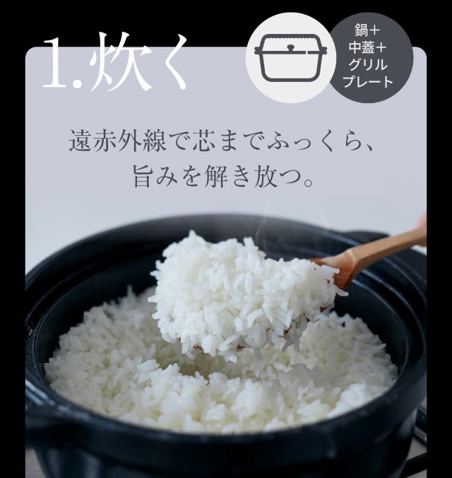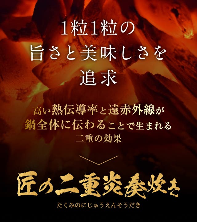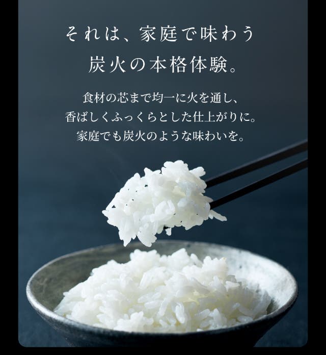 - 炭の遠赤外線と高い熱伝導で、お米を芯までふっくら。甘みを解き放つ。