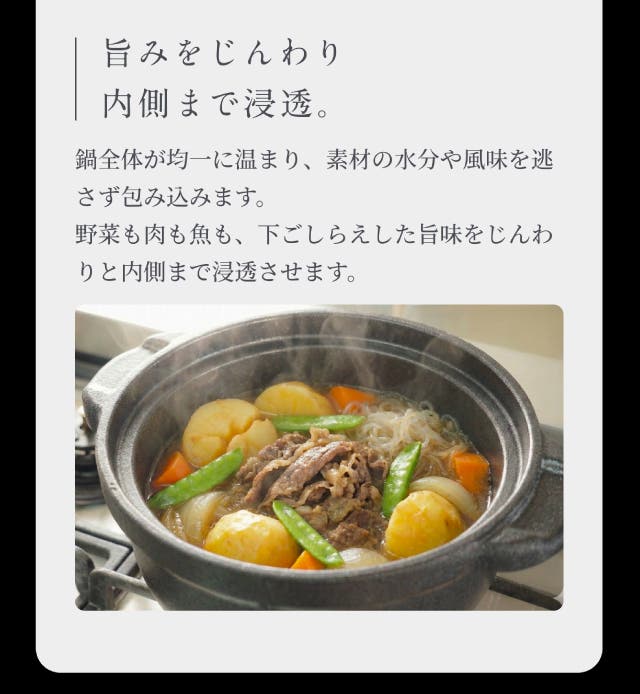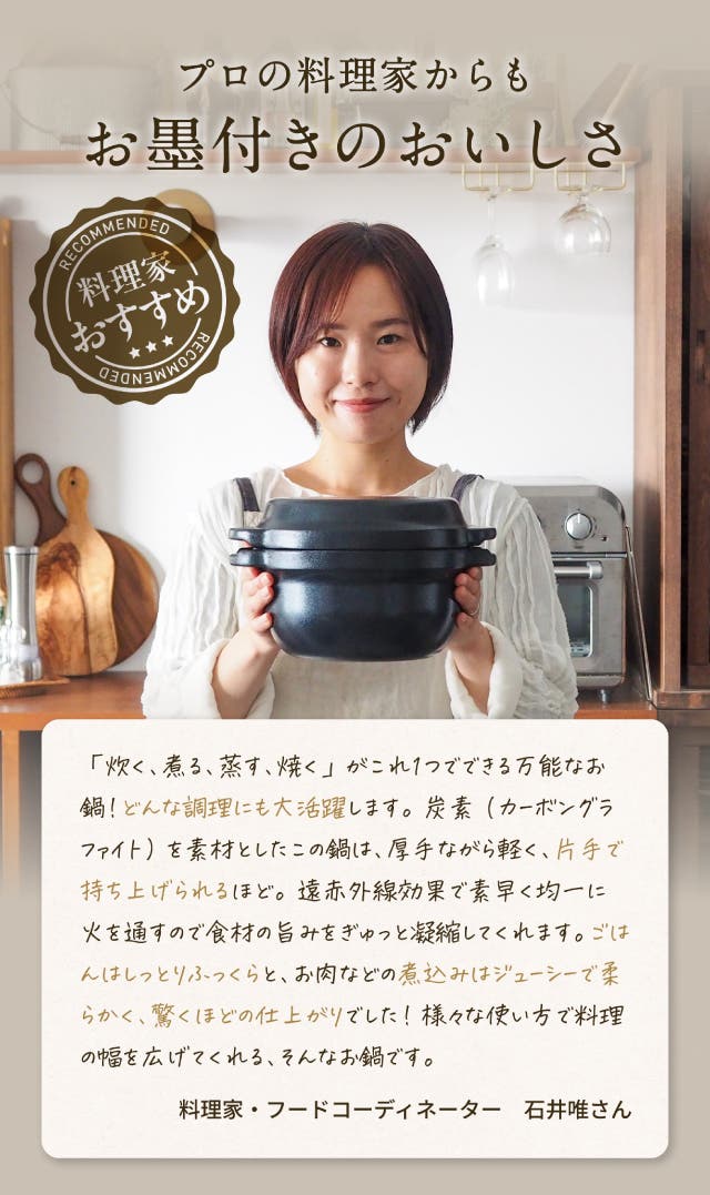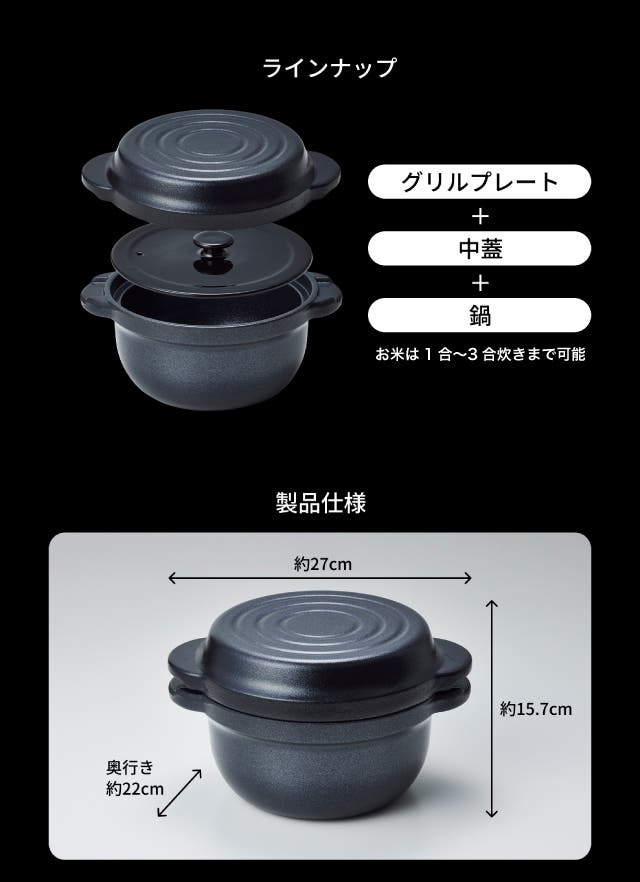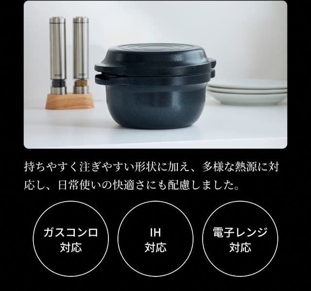 さらに、お米マイスター監修の炊き方により、お米はふっくら・しっとり・甘みまで引き出され、美味しく炊き上がります。フッ素・テフロンゼロで安心、炊く・煮る・蒸す・焼くまで幅広く使えるオールインワン鍋です。