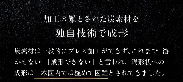 純度99%の炭素材を使用し、加工が非常に困難とされてきた炭を独自技術で鍋として完成させました。