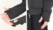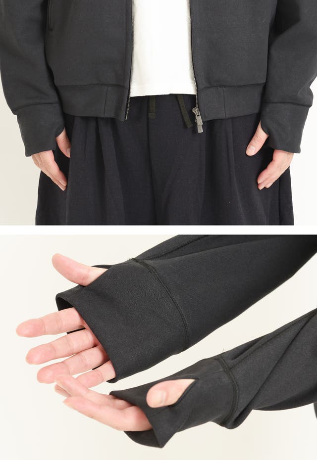 袖口にはフィンガーホール(サムホール、親指を通すタイプ)を付けて、手の甲まで快適にサポートする。