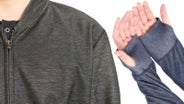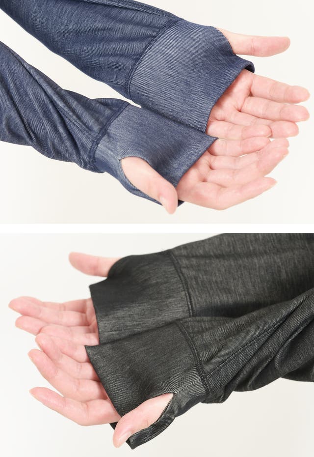 袖口にはフィンガーホール(サムホール、親指を通すタイプ)を付けて、手の甲まで快適にサポートする。