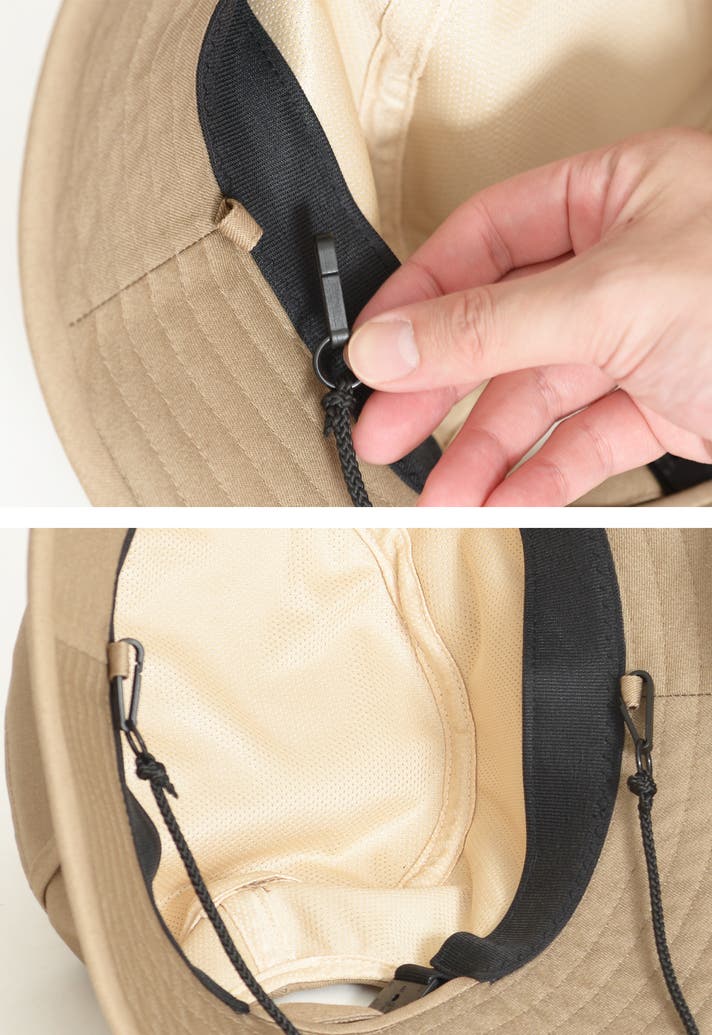 ハットにはあまり見られない【アジャスター付き】でサイズ調節ができ、大きいサイズの方まで対応可能。カバンやベルトループに通して持ち運びも可能で、「手ぶら欲求」も満たします。