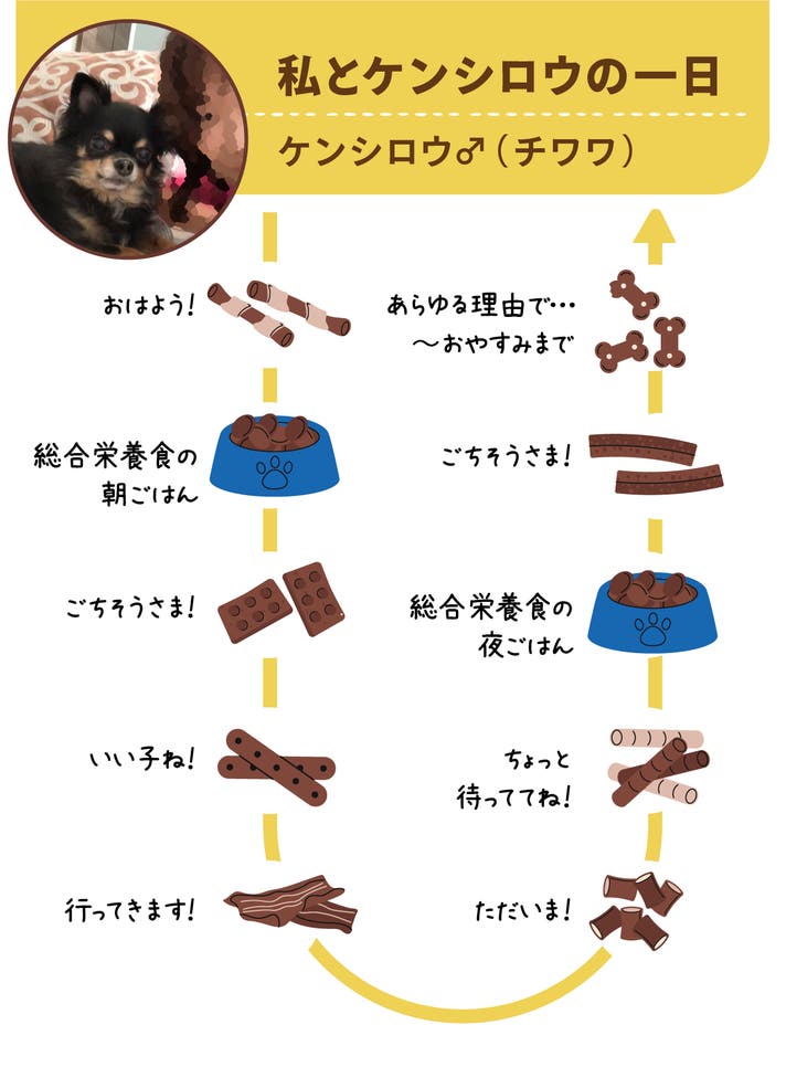 上記のイラストの場面以外にも、こんな風に私は一日のあらゆる場面でケンシロウにおやつをあげてきました。