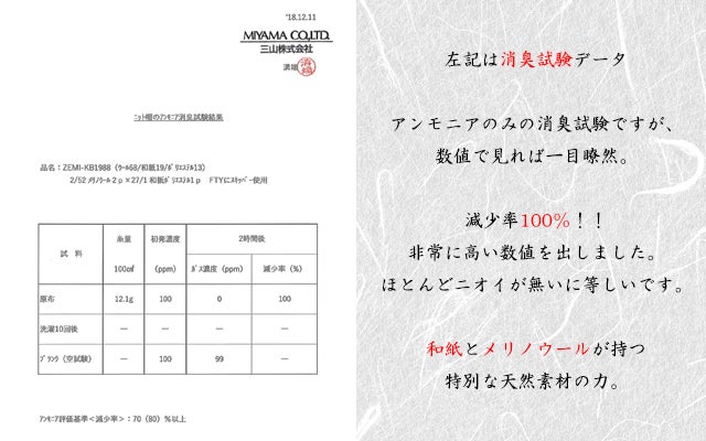 - 消臭や通気性など機能性に優れた伝統の和紙と、オーストラリアの最高級メリノウールを採用