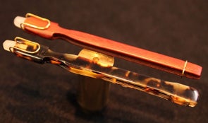 パドック材での試作:パドック材はギターなどに使われる美しい樹木ですが、一ミリ以下にまで削り込むので、加工中や使用中に割れてしまうなどの問題がありました。それでも、赤茶の木肌が美しく、クリップの金色とあいまってクルーザーをイメージさせるデザインが捨てがたいので、新たに木製用のホルダーとペン軸を固定するクリップをデザインして割れないホルダーを実現しました。