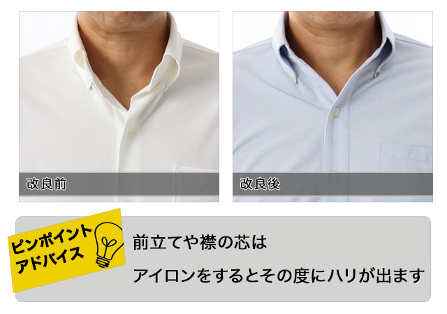 第一ボタンを開けた時に、前立て部分がしっかり立つように改良