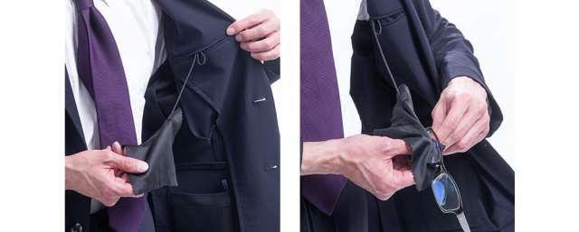 内側のポケットに専用のスペースを設け、メガネクリーニングのマイクロファイバーの専用布も内臓。いつでも取り出して、メガネやスマホをキレイに拭くことができます。