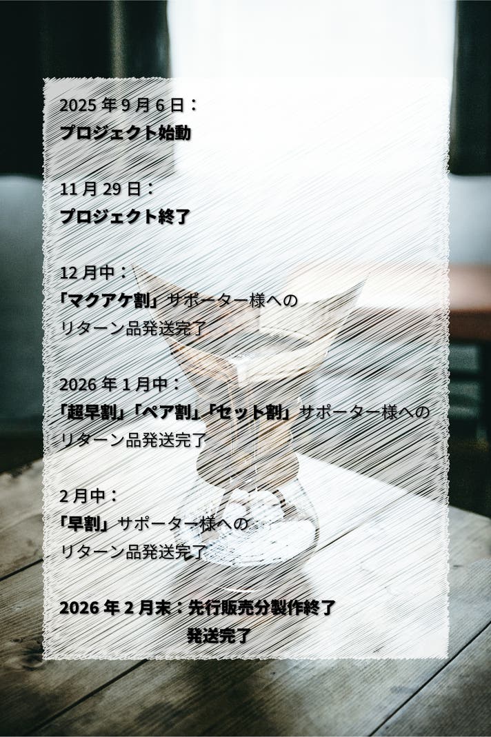 ※リターン配送は全て2026年2月まで(3ヶ月間)に完了とさせて頂きますが、完成したものにつきましては、順次サポーター様へのリターン配送を並行して行なっていく予定です。