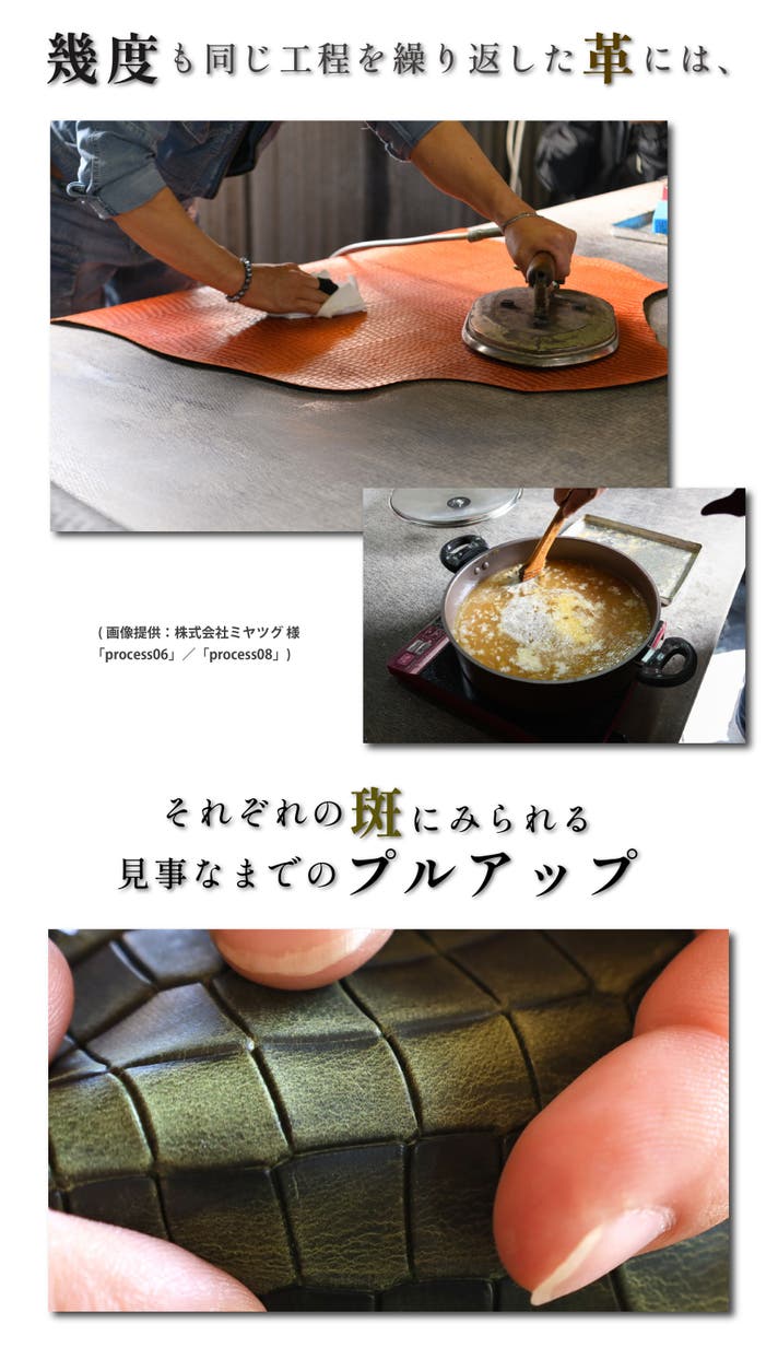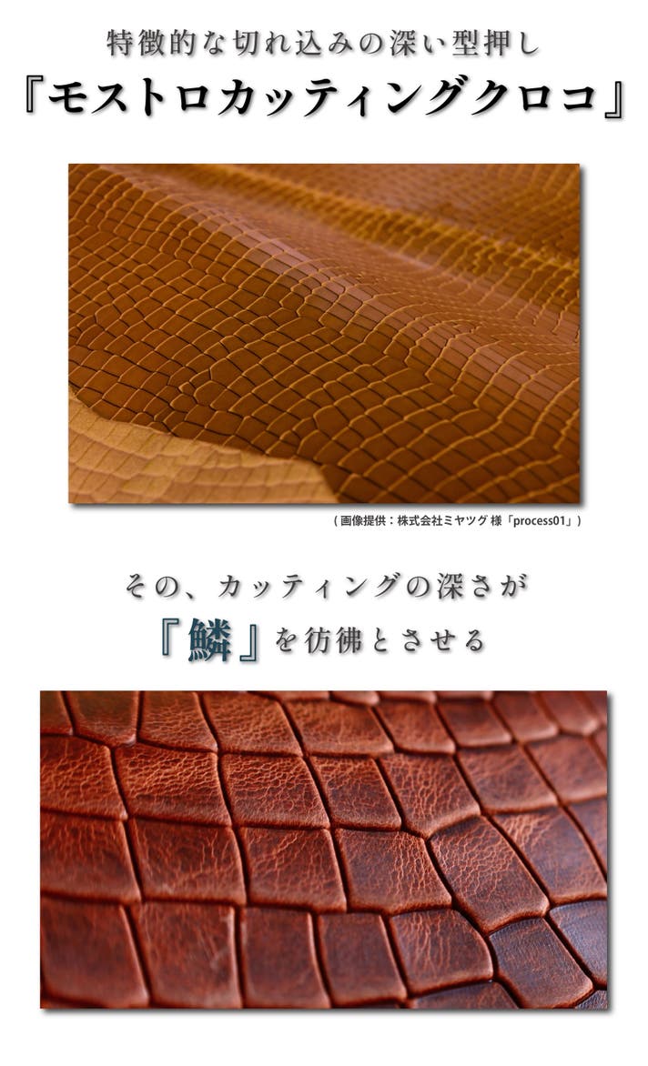 選定革は、株式会社ミヤツグさんが取り扱っているオリジナルレザー「モストロカッティングクロコ」。革の柔らかさと恐ろしいまでのエイジングに加え、他では見かけることのない深い型押し(カッティング)が特徴的な皮革。