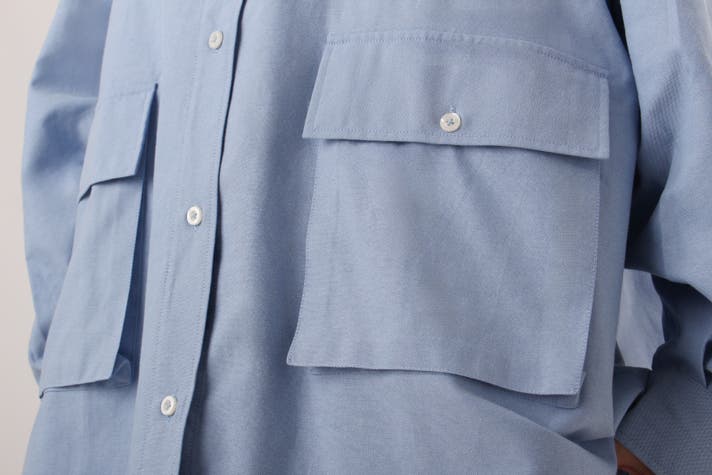 クラシックなワークシャツへの敬意を込めた、少し大きめのダブルポケット。