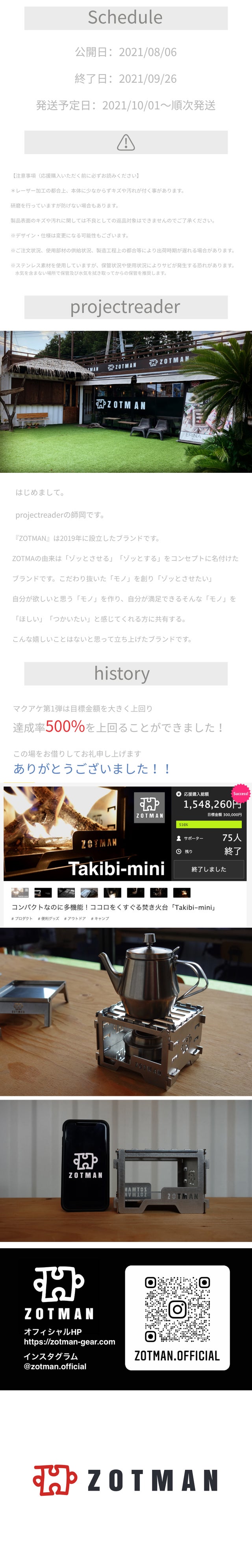 私たちはtakiBIGs470を生産するために、各種工程や協力業者と力を合わせこのアイテムの商品化を実現できるようプロジェクトを進めております。 しかしながら完成度を高める工程においてデザイン、仕様が一部変更になる可能性もございます。製造スケジュールについては、現在プロジェクト成功を想定した数で調整しておりますが、想定を上回る応援購入の申し込みがあった場合、製造工程上の都合や配送作業に伴うやむを得ない事情によりお届けが遅れる場合がございます。上記のようにプロジェクトページに記載している内容に変更がある場合は、できるだけ早く活動レポートなどで共有を行っていく予定です。 商品を手に取っていただいた皆様に喜んでもらえるよう、チームメンバー一同心を込めて対応していきますので、応援よろしくお願い致します。 by ZOTMAN projectreader MOROOKA 【キャンセルについて】 応援購入者様によるキャンセルは一切受け付けできません。誤っての注文も同様となります。 本文中に記載させていただいたスケジュールは、あくまでプロジェクト公開時点の予定です。応援購入の性質上、配送遅延のおそれがございます。 原則として、配送遅延に伴う応援購入のキャンセルはできませんが、 リターン配送予定月から6ヵ月を超えた場合には、希望者に限りキャンセルにて対応させていただきます