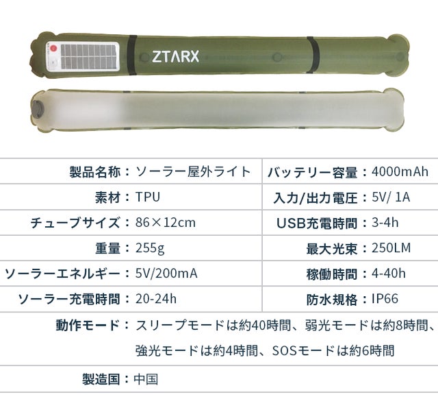 キャンプ到着後、ZTARXソーラーライトを取り付けたら、太陽エネルギーから電力を蓄えることができます。日が沈んだら蓄えた電力で夜間照明を点灯させます。またMicro-USBケーブルにて充電できるため、非常に便利です。