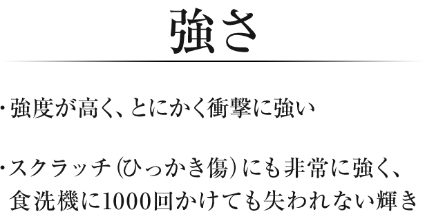 また、表面硬度が高いため、割れにくく、傷が付きにくいのが特徴です。