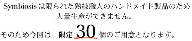 A. Symbiosisは限られた職人が一つ手作業で仕上げるため、大量生産ができません。そのため、今回のプロジェクトでは30個限定のご提供となります。